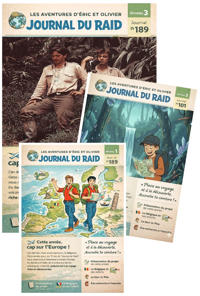 À travers les aventures d’Eric et Olivier, les élèves partent chaque année scolaire à la découverte d’un grand thème (la nature, l’Europe, le monde…), abordé de manière concrète, ludique et progressive.